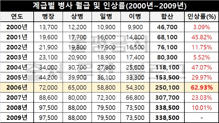 20년 전이라는 먼 얘기겠지만 현재 2020년 상병 월급과는 다르게 2000년도에는 병장 13,700원. 상병 12,200원. 일병 10,900원. 이병 9,900원 이였답니다. 저 때는 정말 많이 못 받던 시절이였죠. 군 복무도 길었는데 말이에요.