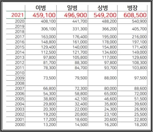 2021년 상병 월급 이등병,일병,병장도 같이