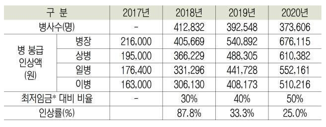 그리고 2021년 병장월급은 608,500원 이며, 상병월급은 496,900원 이고, 일병월급은 549,200원입니다. 그리고 이등병 월급은 459,100원 입니다. 이렇게 사병월급들은 현재 지속적으로 올라가고 있습니다. 자세한 부분은 아래 표를 확인해보시면서 그동안 얼마나 올라왔는지 확인해 보시면 될듯 합니다.