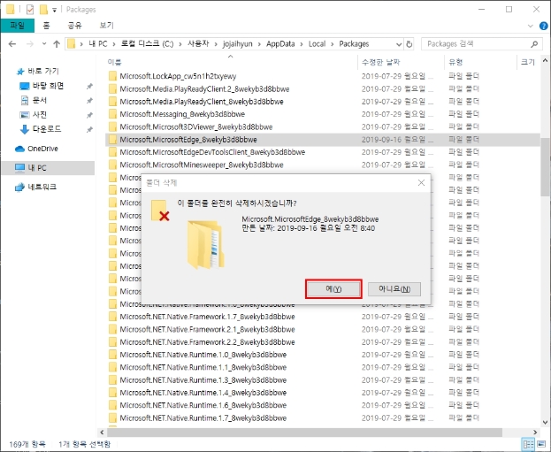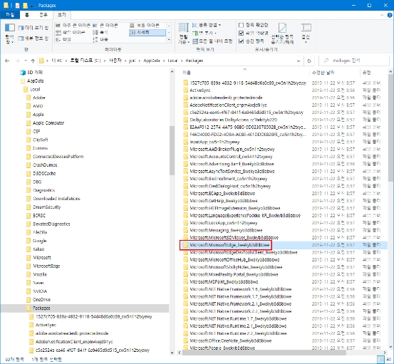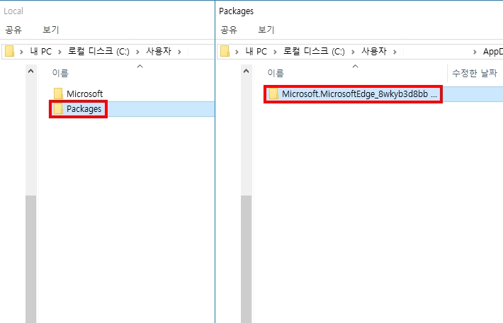 내 PC 폴더에서 숨김항목에 체크를 해 주시면 됩니다. 그리고 로컬디스크C > 사용자 > AppData > Local > Packages 이 순서대로 진입해 주시면 됩니다. 그리고 Packages 폴더에 가시면 MICROSOFTEDGE삭제 할 수 있는 microsoft.microsoftEdge 폴더가 보일것입니다. 그걸 삭제해주시면 됩니다.