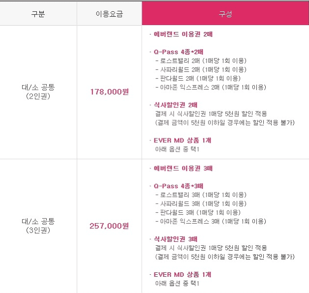유치원생 때부터 에버랜드 사파리는 필수 코스였습니다. 그리고 어른이 되서도 에버랜드는 가끔 가고 싶은 곳이기도 합니다. 어린이부터 성인까지 에버랜드 사파리를 가려면 요즘은 가격이 얼마나 하는걸까? 인기 많은 에버랜드 사파리는 놀이기구타는 것과는 같은 이용권으로 이용할 수 있는데 이용권 가격이 대인, 청소년, 소인및경로에 따라서 가격이 다르기에 잘 확인하고 끊어야 합니다. 이용권 정보로는 [ 주간권(1일권 대인 5만4천원/ 청소년 4만6천원 / 소인및경로 4만 3천원 입니다. 또 야간권(17시 ~ ) 대인 4만5천원 청소년 3만9천원 소인및경로 3만6천원입니다., 2일권은 8만4천원 청소년 7만1천원 소인및경로는 6만7천원입니다.] 그리고 에버랜드 패키지 상품은 자유이용권 +@ 개념의 티켓입니다. 근데 이 티켓이 아이들이 가장 좋아할만한 티켓으로 아이들에게 인형을 선물로 주고 식사 할인권 및 큐패스 등의 서비스를 제공하는 상품입니다. 사파리 큐패스를 포함해서 상품들은 주토피아 패키지와 슈퍼 프리미엄 패키지가 있는데 이미지를 참고하시기 바랍니다. 마지막으로 사파리 월드는 휴일에만 탑승예약제를 운영하고 있다 합니다.
