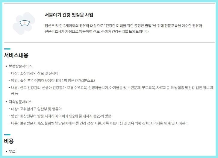 그리고 혹시라도 첫아이라면 서울아기 건강 첫걸음 사업을 꼭 이용해 보시기 바랍니다. 서울시에 거주 중인 분들만 해당 하는 부분이긴 하지만 서울 아기 건강 첫걸음 사업으로 영유아 전문간호사를 각 가정들에 방문하는 것인데 요청하면 직접 방문해서 육아에 필요한 정보들을 알려주며 건강상태까지 체크 해주는 사업이라고 합니다. 신청방법은 해당 지역의 보건소등에 전화 또는 방문해서 신청이 가능하다고 합니다. 첫육아라면 꼭 필요한 부분이니 참고하시기 바랍니다.