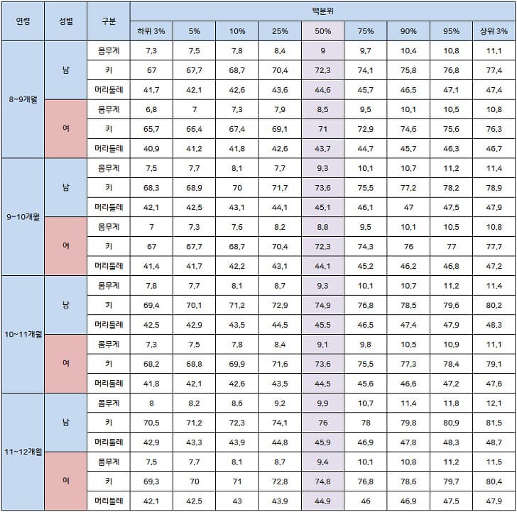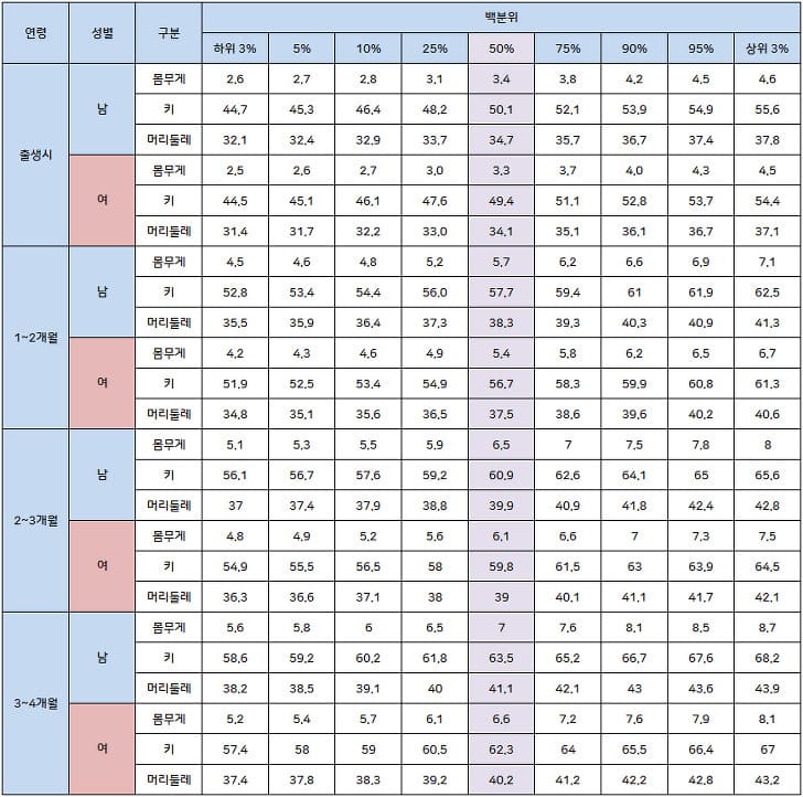 앞서 말씀드린 신생아 0 ~ 12개월 평균 몸무게표를 보셨다면 앞으로 성장하는 우리아기의 백분율표도 체크해보아야 하는 사항입니다. 물론 병원의 담당선생님 또는 간호사분이 잘 체크해주시고 알려주시겠지만 산후조리를 못하고 출산 후 바로 나오게 되시는 많은 분들이 있기에 꼭 해당 표들을 잘 체크하시고 이에 대한 아이 영양 및 성장발육에 관심을 가져주어야 하는 부분입니다. 그리고 혹시나 위에 말한 일주일에 200g 또는 한달 800g이 아닌 몸무게 증가가 더디다던지 급격한 감소가 있다면 즉시 소아과 관련으로 상담을 받아보셔야 하는 부분입니다.