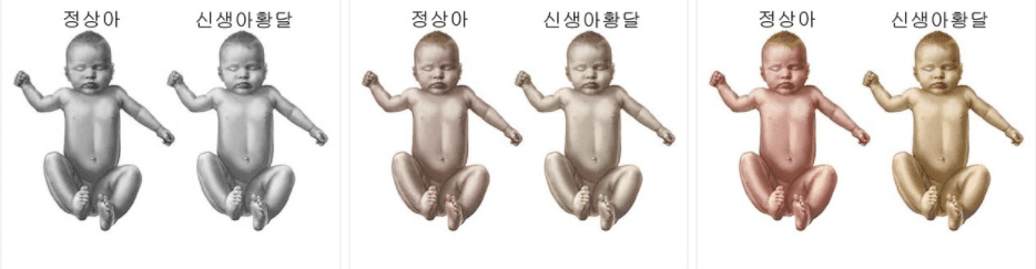 [병적인 황달 : 생후 24 ~ 36시간 이내 황달이 발생 10 ~ 14일 이후에도 황달이 지속 발생 이것은 혈청 빌리루빈의 증가 속도가 5mg 초과하는 경우에 병적인 황달에 속한다고 합니다. 이때는 병원을 가는것이 가장 좋은 방법이고 치명적인 부분은 아니지만 고빌리루빈혈증의 가장 심각한 후유증 중 하나인 신경 독성이 있다고 합니다. 그중 핵황달은 신경학적 증후군이라고도 불리는데 매우 위험한 부분이라고 합니다.] 신생아 황달은 혈중 빌리루빈이 증가하여 생기는 증상이기에 꼭 아이엄마가 잘 확인해주어야 한다고 합니다. 피부를 눌렀을 때 노란빛이 얼굴에만 나타나고 있으면 간접 빌리루빈이 5mg/dL, 복부 중앙까지 나타나면 12mg/dL, 발다닥까지 나타난다면 20mg/dL으로 추정이 된다고 합니다. 그리고 황달이 배 아래까지 나타난다면 꼭 혈액 검사를 진행해야 한다고 합니다.