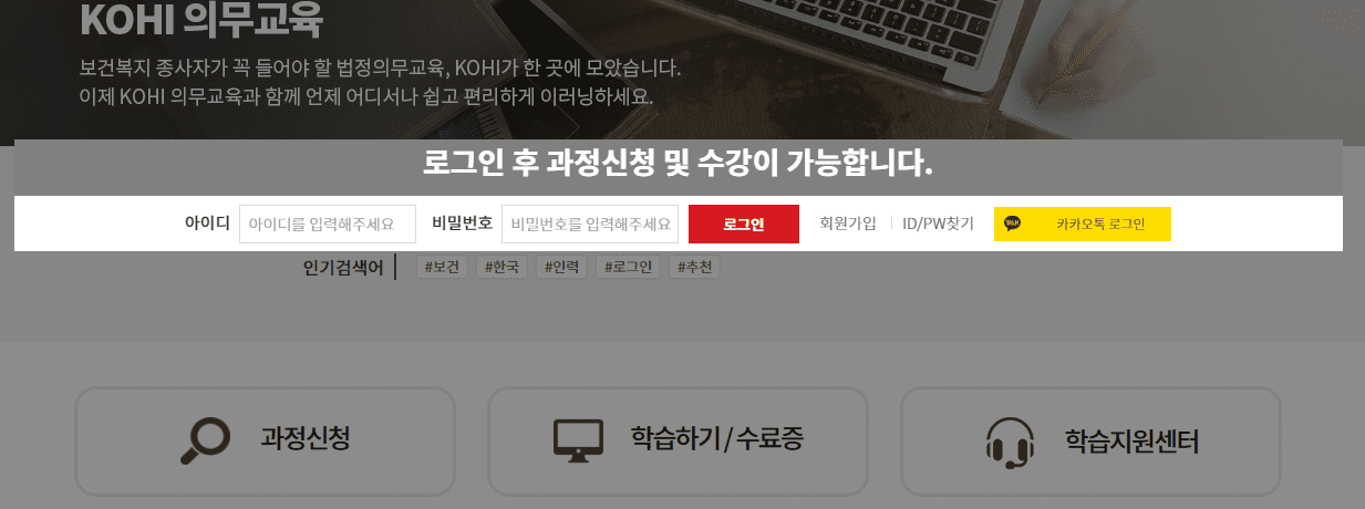 포털사이트에서 [KOHI 인권교육을 검색하고 사이트에 들어가기] 그리고 신규요양보호사는 꼭 회원가입을 해야 합니다. 회원가입 후 교육과정을 검색합니다. 여기서 노인인권교육과정을 검색하시고 신청하시면 되는데 수강신청 > 사이버교육 > 검색 클릭 > 과정신청 > 노인인권 > 노인인권의 첫걸음(방문요양서비스편) 클릭 > 수강신청 클릭 > 학습하기 > 강의를 마친 후 설문조사 > 추가교육으로 학대신고 교육까지 이수하시면 완료 됩니다. 여기서 신고자의무교육은 1시간이며 노인인권교육은 오프4시간, 온라인6시간입니다. 참고하시기 바랍니다. 해당 교육은 필수 교육입니다. 매년 1번 듣는 교육이기에 꼭 참고하시고 들으시기 바랍니다. 궁금하신점은 노인인권교육 사이트 1600-8810 고객센터로 전화하셔서 궁금하신 사항 확인해보시기 바랍니다.