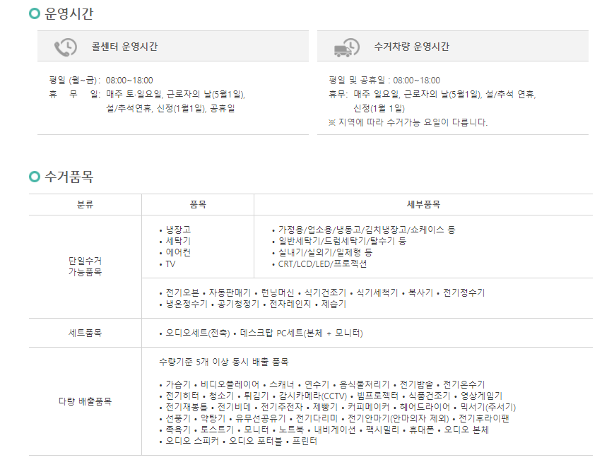 방법은 포탈에서 폐가전제품 배출예약시스템 이라고 검색하면 해당 사이트가 나옵니다. 전국어디든지 이용이 가능한 사이트 이며 앱 및 모바일을 통해서도 등록이 가능한 서비스 입니다. 콜센터 운영시간으로는 평일 08 ~ 18시까지 이며 휴무일은 공무원 휴일은 전부 쉰다고 생각하시면 됩니다. 수거차량은 콜센터와 동일한 운영시간이며 휴무는 토요일 빼고 모든 휴일들은 쉽니다. 수거 품목으로는 단일수거, 세트품목, 다량배출품목이 있으며 수거를 진행할 때 큰 가전제품은 1개면 되지만 작은 가전제품 휴대폰, 마우스, 키보드, 모니터 같은 것들은 최소 3개 이상은 수거 품목에 등록해야 수거를 해간다고 합니다. 좀더 자세한 내용은 사이트를 통해서 진행하시기 바랍니다. 그리고 저도 이용을 해보았는데 수거 등록하고 수거날 밖에 미리 내놓으면 알아서 수거해갑니다. 물론 잘 정리해서 내놔야 합니다.
