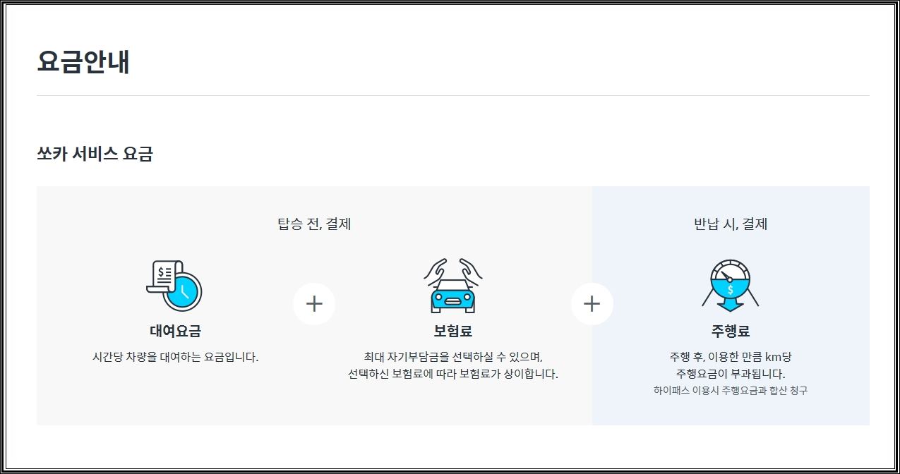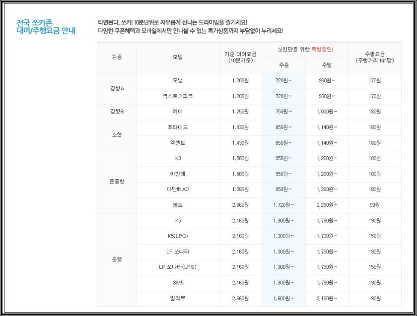 쏘카 기름값 비용 말고도 기본적으로 대여요금과 보험료도 함께 지불하셔야 합니다. 각자 주행한 거리 만큼의 주행 료가 붙게 되는 것입니다. 경차, 소형차, 준중형, 준대형 모두 가격이 다르기 때문에 궁금하신 분들인 쏘카 홈페이지에 들리셔서 확인해 보시기 바랍니다.
