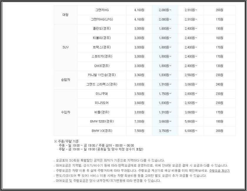 쏘카 기름값 비용 말고도 기본적으로 대여요금과 보험료도 함께 지불하셔야 합니다. 각자 주행한 거리 만큼의 주행 료가 붙게 되는 것입니다. 경차, 소형차, 준중형, 준대형 모두 가격이 다르기 때문에 궁금하신 분들인 쏘카 홈페이지에 들리셔서 확인해 보시기 바랍니다.
